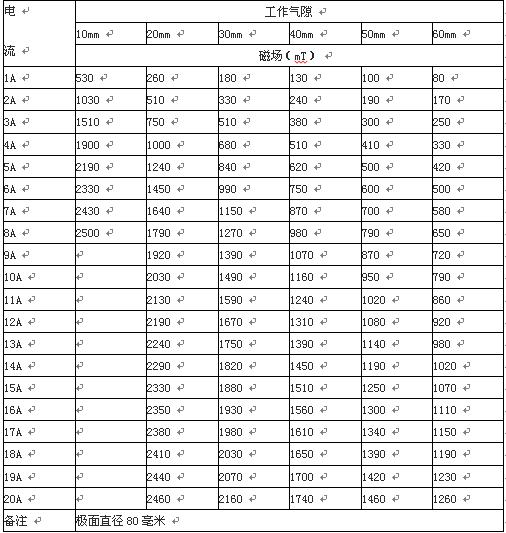 4.3 磁场强度:工作气隙20mm时,60mm极头中心磁场最大H≥2.5T